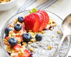 Tiny chia seeds are rich in fiber. Soaking them in milk creates a filling pudding that's easy to prepare ahead and can be flavored with fruits or spices.